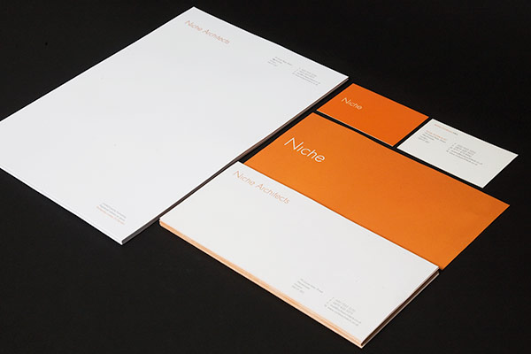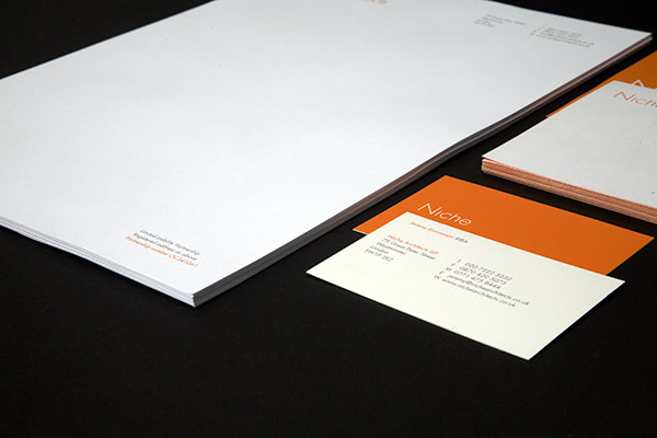 A full set of stationery print materials continue the clean and stylish feel of the branding, using the strong orange colour of their brand to create a strong, distinctive feel.
